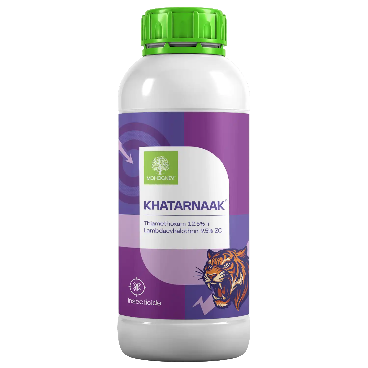 Khatarnaak is a combination insecticide containing Thiamethoxam 12.6% and Lambda-Cyhalothrin 9.5% ZC. It exhibits both quick stomach and contact activity, providing excellent control over a wide range of insect pests such as aphids, jassids, thrips, and bollworms in cotton. The formulation ensures long-lasting protection and quick knockdown action, improving crop health and yield.
